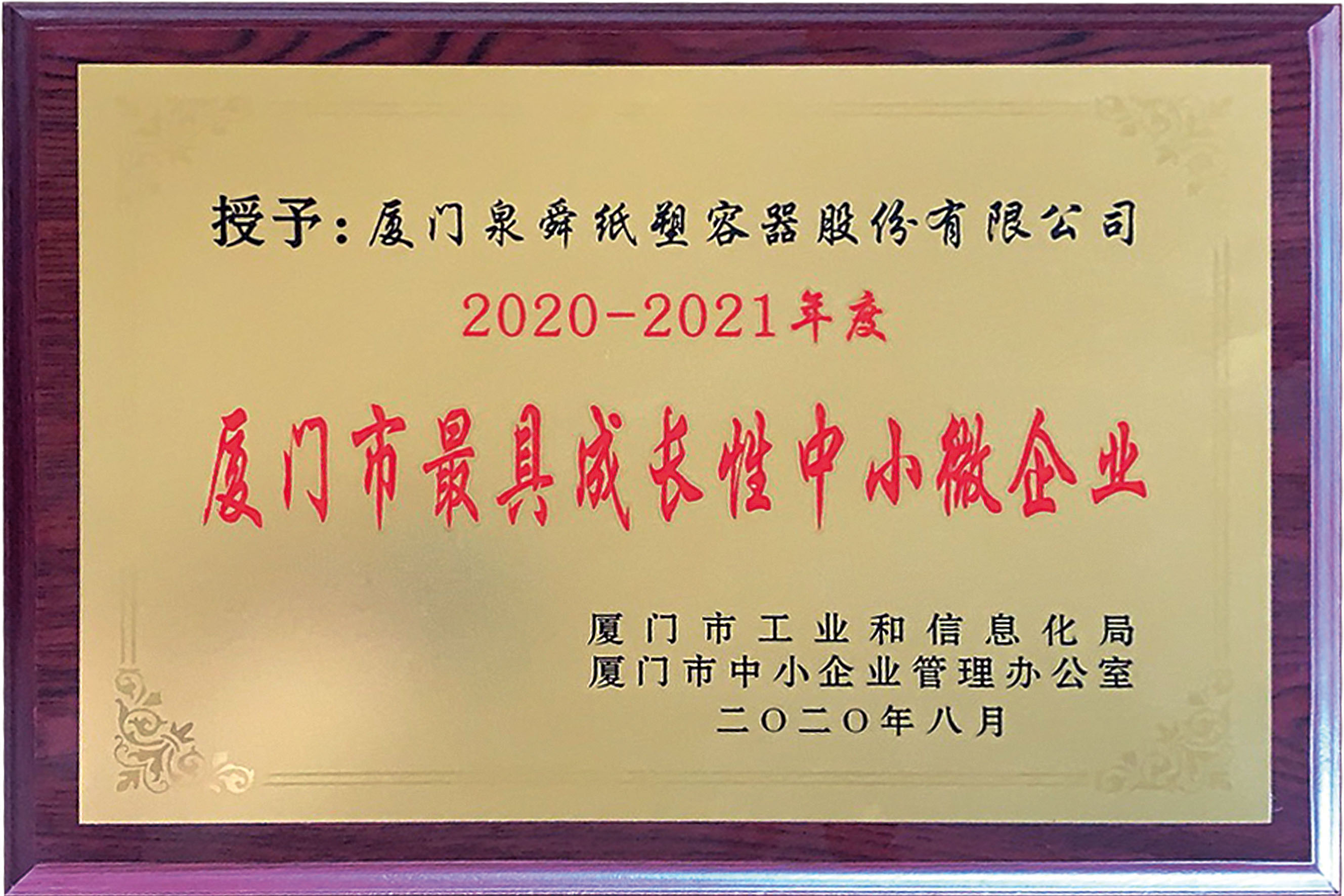 2020年8月,经过评审方严格的初审、再审、终审后,纸塑容 器公司再次获评为由厦门市工业和信息化局、厦门市中小企业管理办 公室联合评选出的2020-2021年度厦门市最具成长性企业。这是公司 继2009年以来第九次获评此称号。